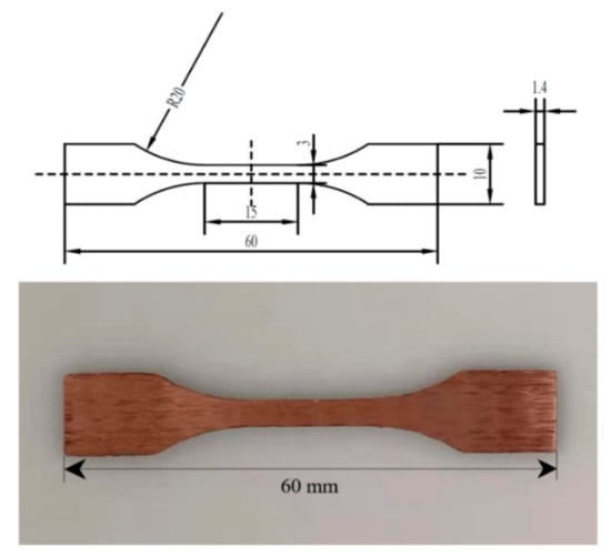 The microstructure is observed by an optical microscope (OM, Axiovert 200 MAT metallurgical microscope). The selected samples are treated by metallographic method, and then etched with a mixed solution of 1.5 g FeCl3, 10 mL HCl and 30 mL distilled H2O for 15 s. The distribution of elements, micromorphology and precipitates of LPBF Cu–Cr–Zr alloy samples are analyzed by a scanning electron microscope (SEM, FEI Nano SEM 450), equipped with energy dispersive spectrometry (EDS). Phase identification is tested by X-Ray Diffraction (XRD, Bruker AXS D2 PHASER) with Cu-Kα radiation at 30 kV and 10 mA. Microhardness tests are carried out with a 200 HV-5 microhardness tester at a load of 4.9 N and a holding time of 15 s. In order to adapt to the special fixture, the tensile specimens are designed according to the standard of Figure 6 and using a Zwick/Roell tester at a tensile rate of 2 mm/min under quasi-static loading to evaluate the tensile properties at room temperature. After rupture, the fracture morphologies are analyzed by SEM.