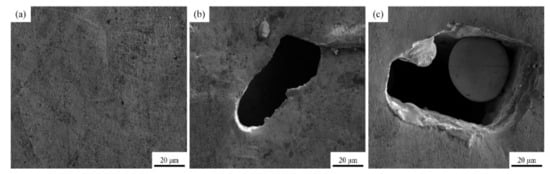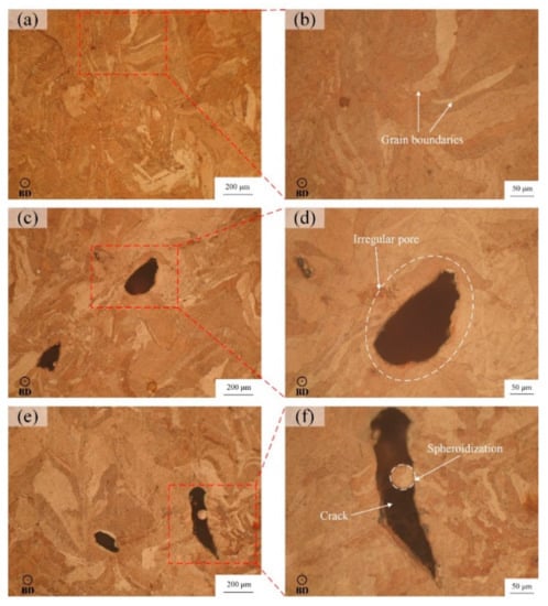 As shown in Figure 8a,b, the sample 2 is relatively dense under the optical microscope with fewer defects, and obvious grain boundaries can be seen after corrosion. In Figure 8c,d, due to the lower laser energy density, the gas between powder particles will not escape during the laser scanning, which will produce more pores. On the other hand, the low energy density is not enough to melt the powder completely, and the molten pool cannot be fully spread, which will form an irregular molten pool boundary, resulting in irregular pores which are clearly visible. In addition to the pores, there are also large cracks in Figure 8e. The reason for the cracks is that the high laser energy density leads to excessive stress intensity factors caused by the residual stress at a flaw or support structure. As a result, the cracks are generated in the solidification process of the molten pool and propagate along the melt channel, resulting in a decrease in the relative density of sample 13. After enlarging the crack area, Figure 8f shows that there is obvious spheroidization in the crack. This is because the temperature of molten pool is too high, which causes the metal droplets to boil and splash to other areas, solidify and shrink, and then form spheroidization, which leads to the drop in relative density [34].