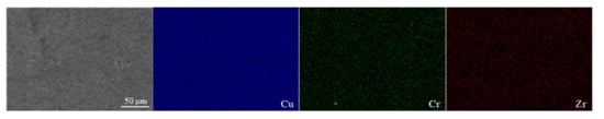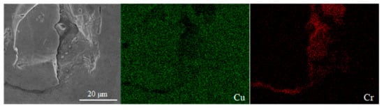 According to the Cu–Cr binary phase diagram [35], the eutectic reaction of Cu and Cr occurs at 1076.2 °C, and the highest solubility of Cr is 0.65 wt.%. The solubility of Cr decreases with the decrease of temperature, and Cr is almost insoluble in Cu at room temperature. Figure 12 shows the SEM images of the precipitates observed on the surface of the LPBF sample, in which a large number of fine spherical precipitates are about 1 μm in size. Continuously, the performance of the EDS surface scan is analyzed in Figure 12a, and it can be seen from Figure 13 that the segregation of Cr really occurs in this area. Furthermore, the EDS line scan analysis of Figure 12b shows that the Cr content fluctuates greatly during the scanning process, and the Cr is less than 10 wt.% at the initial stage of scanning, but Cr on the spherical precipitates is more than 40 wt.%, which indicates that Cr is enriched here, and the fine spherical particles are Cr precipitates. The formation of the Cr precipitates may be caused by the rapid solidification and the defects such as pores and cracks in Figure 12a. The constitutional supercooling occurs at the interface of the defect area, and solute redistribution appears during the non-equilibrium solidification process, which leads to the Cr segregation. The second reason may be the solubility limit of Cr in the copper matrix, which leads to the enrichment of Cr and the formation of a large number of fine precipitates.
