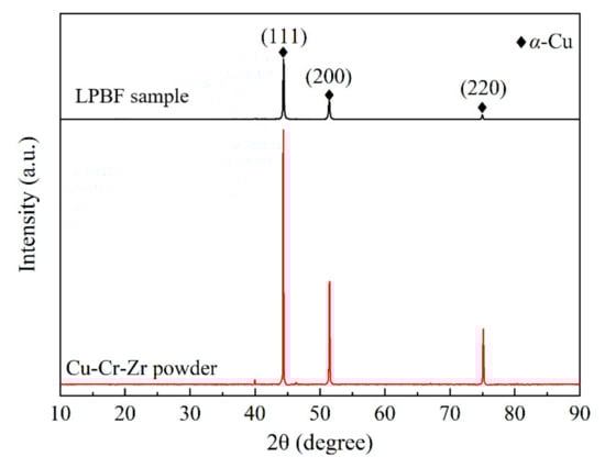 XRD patterns of the LPBF sample fabricated with optimal process parameters and the virgin powder are presented in Figure 11. It is evident that the main phase is α-Cu phase due to the detection limit of the XRD device. Interestingly, the intensity and distribution of Bragg peaks for the virgin powder are very close to those of the standard PDF card; a similar phenomenon has also been reported by Ma et al. [28]. For the LPBF sample, the Bragg peak with a crystal face index of (111) has the strongest intensity, which is consistent with the virgin powder. Moreover, the Bragg peak width of the LPBF sample is wider than that of the virgin powder, indicating that grain refinement occurs, which is caused by rapid cooling and solidification.