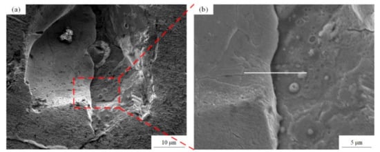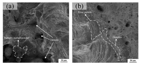 The tensile samples A and B have showed an obvious necking phenomenon in the macroscopic view, illustrating a ductile fracture feature. From the high magnification views exhibited in Figure 16a,b, the dimple-like and river-like features can be clearly observed on the fracture surface, which confirms that the fracture mode of LPBF Cu–Cr–Zr alloy is not a single, but a mixed ductile-brittle mode, although Figure 16a possesses many partially melted powders and defects, which are caused by the high laser energy density of E = 208 J/mm3 as listed in Table 5, and the results are consistent with the analysis of microstructure. The number and size of the dimples are positively correlated with the energy absorbed during their formation, and the corresponding plastic deformation changes are obvious during the fracture process, showing the greater toughness of materials. In general, these can also explain that the sample A has a lower elongation than sample B.