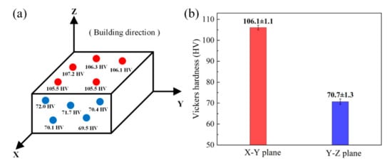 (a) The microhardness test results and (b) the average Vickers hardness of X–Y plane and Y–Z plane.