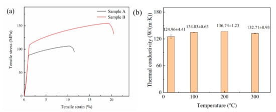 (a) Stress–strain curves of sample A and sample B at room temperature and (b) the thermal conductivity of LPBF Cu–Cr–Zr alloy at different temperature.