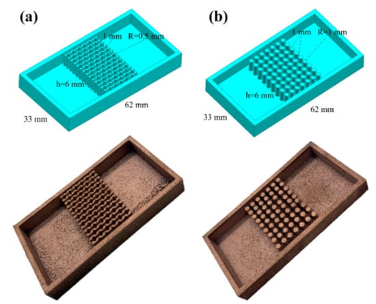 The optimized LPBF parameters are applied to fabricate two types of copper alloy heat sinks, the parallel fin heat sink with the fan-shaped cavity and the cylindrical micro-needle heat sink as selected, exhibited in Figure 17. The dimensions of the two heat sinks are exactly the same, but the structure of internal heat sink is different.