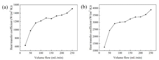 Based on the experimental platform in Figure 7, the heat dissipation effects of two Cu–Cr–Zr alloy heat sinks have been tested and compared. The relationship between the volume flow and the heat transfer coefficient of the two types of heat sink are shown in Figure 18. When the volume flow is 250 mL/min, the maximum heat transfer coefficient of the parallel fin heat sink with fan-shaped cavity is 1505 W/(m2·K) shown in Figure 18a, whereas the maximum heat transfer coefficient of the cylindrical micro-needle heat sink is 3887 W/(m2·K) shown in Figure 18b. The heat transfer coefficients of the two heat sinks are positively correlated with the volume flow. Under the condition of a certain volume flow, the heat transfer coefficient of the cylindrical micro-needle heat sink is always higher than that of the parallel fin heat sink with fan-shaped cavity. Therefore, the heat dissipation performance of the cylindrical micro-needle heat exchanger is better.