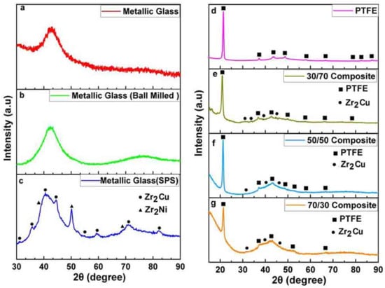 The broad diffraction pattern (Figure 1a) of the Zr65Cu17.5Ni10Al7.5 metallic glass shows its amorphous nature. Amorphous broad halo diffraction can be seen at 2Ɵ ≈ 38–50° in the XRD pattern. After ball milling (Figure 1b), the metallic glass stayed amorphous. The XRD pattern of the metallic glass after SPS (Figure 1c) shows that the metallic glass was semicrystalline. After SPS, there was a formation of crystalline Zr2Ni and Zr2Cu phases in the metallic glass []. As compared to our previous results, it should be concluded that the intermetallic phases were formed during the SPS procedure. PTFE (Figure 1d) shows a crystalline nature with the most intensive peak at 2Ɵ = 21°. The composite materials 30/70 (Figure 1e), 50/50 (Figure 1f) and 70/30 (Figure 1g) show crystalline peaks similar to PTFE. The broad spectrum from the peak at 2Ɵ ≈ 38–50° shows the amorphous nature of the 30/70, 50/50 and 70/30 composite samples, with a small nanocrystalline Zr2Cu phase (no more than 5%).