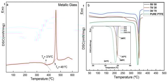 The DSC thermogram of the Zr65Cu17.5Ni10Al7.5 metallic glass (Figure 2a) shows that Tg is 374 °C and Tx is 461 °C. The Zr65Cu17.5Ni10Al7.5 metallic glass has a large supercooled region of 87° C. This is in good agreement with the work of Abrosimova et al. []. The heating rate for the metallic glass sample is 10 °C/min. The melting temperature of the PTFE is 341 °C (Figure 2b). The composite samples have a melting point near the PTFE. The criteria for choosing the polymer were its physical properties and its melting temperature near the supercooled region of the metallic glass. This criterion was also used in our previous works [,,]. The composites have a melting temperature of 346 °C for 30/70, 347 °C for 50/50 and 348 °C for 70/30 (Figure 2b) composites.