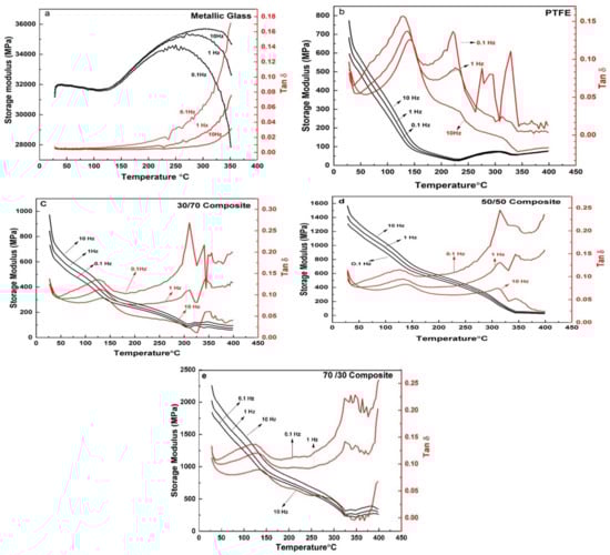 DMA was used to study the atomic ability [] of the metallic glass, PTFE and their composites. Atomic mobility is decreased by the structural relaxation due to a decrease in the defect concentration. The loss factor (Tan δ) increases with an increase in defect mobility. The change in the atomic mobility influences the structural relaxation and internal friction that caused α and ß relaxation in the composite and PTFE samples. For the metallic glass (Figure 3a), the storage modulus is maximum at 250 °C at 0.1 Hz, 270 °C at 1Hz and 301 °C at 10 Hz. The loss factor (Tan δ) increases with an increase in temperature. The maximum value for the metallic glass is 31,691 ± 317 MPa at 0.1 Hz, 31,194 ± 312 MPa at 1 Hz and 31,428 ± 314 MPa at 10 Hz. The 70/30 composite (Figure 3e) has the highest storage modulus compared to the 30/70 and 50/50 composites (Figure 3c,d). PTFE has the lowest storage modulus among the samples (Figure 3b).