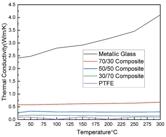 The thermal conductivity of the metallic glass (Figure 4) increases with an increase in temperature. It has the highest thermal conductivity (Table 1) compared to other samples. The 70/30 composite (Figure 4) has relatively higher thermal conductivity than the 50/50 and 30/70 composites. PTFE (Figure 4) has the lowest thermal conductivity among the samples.