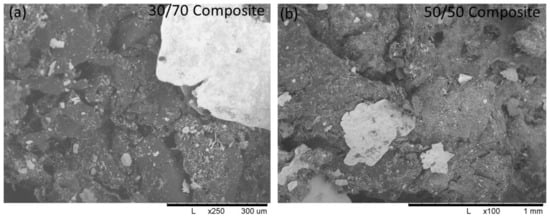 SEM images of (a) 30/70 composite and (b) 50/50 composite.