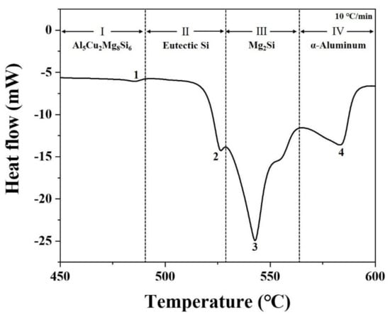Figure 1 shows the DSC heating curve of the base aluminum alloy used in this study. There are four endothermic peaks in the DSC heating curve, which are referred to as peak 1, peak 2, peak 3, and peak 4, respectively. In peak 1, the Al5Cu2Mg8Si6 phase first reacted at 476.5 °C. In peak 2, melting of the eutectic Si phase was observed at 527.4 °C. In peak 3, the melting reaction of the Mg2Si phase occurred at 539.3 °C. Finally, in peak 4, the melting reaction of α-aluminum occurred at 582.5 °C. According to Kim et al., this alloy is reported to have a liquid fraction of 48.6% at 539.7 °C []. Based on these results, the SSP temperatures were set in the temperature range where the liquid fraction was close to 50% through the DSC experiments.