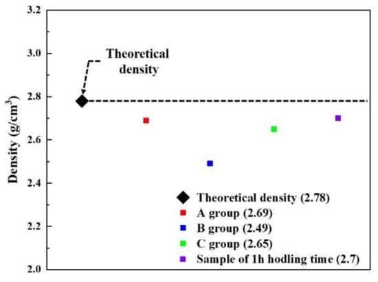 The theoretical density of high-strength aluminum calculated by Equation (1) is plotted in Figure 2 for comparison with the measured values. The relative densities of groups A, B, and C were 96.6%, 89.3%, and 95.3% of the theoretical density of high-strength aluminum, respectively. The sharp decrease in the relative density of the group B samples can be explained by the formation of unintended micro-porosity during the Pl process of the SSP []. The relative density of the group C samples approached the theoretical density because the holding time was increased to 30 min. As shown in Figure 1, the melting reaction of high-strength aluminum alloy began at 470 °C. This results is likely attributable to the reduced pore volume, as the increased holding time at 450 °C enhances local liquefaction on the surface of Al chips [,]. In addition, as the holding time increases, the local liquefaction increases the contact area between the Al chips, which is expected to facilitate the heat diffusion. Therefore, it was inferred that the short holding time caused the low relative density of group B high-strength aluminum produced by the Pl process, whereas the longer holding time of group C high-strength aluminum was sufficient to achieve a near-theoretical density.