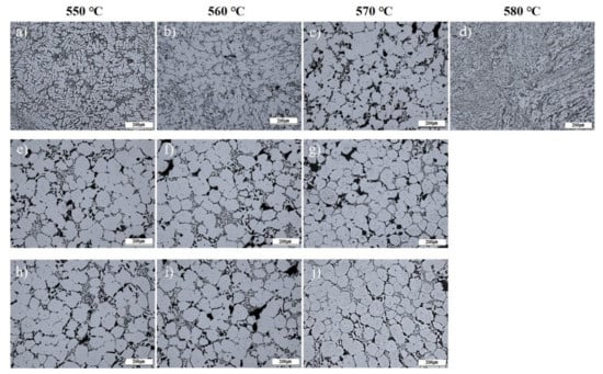 Group A: To optimize the SSP, the holding time and pressure were fixed at 30 min and 80 MPa, respectively, and the final processing temperature was varied as 550, 560, 570, and 580 °C. The best process temperature for the SSP was 570 °C. When the process temperature was reduced to 550 and 560 °C, the Al matrix retained its dendritic structure, whereas the higher temperature (580 °C) exceeded the SS temperature, so the Al matrix was not spheroidized.