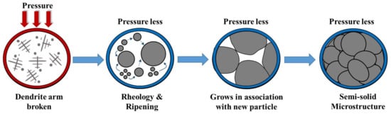 The main requirement for semi-solid (SS) state formation of alloys is the elimination of the dendritic structure during the solidification process. When the connected grains of a dendritic structure are eliminated, a spheroidal or non-dendritic structure is formed. This process takes place at a temperature between the solidus and the liquids. The microstructure of the alloy must be controlled by considering each variable in the SSP because the time, pressure, and temperature of the SSP influence the spheroidization process (breakage of the dendritic arms to create the spheroidal structure).