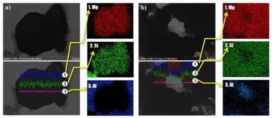 Figure 5 shows the EDX line profiles of the chemical elements of the Mg2Si phase inside the group B and C samples. No pronounced deformation appeared in the Mg2Si phase of the group B sample (Figure 5a). This result implied that deformation of the Mg2Si phase could not occur during the short holding time. In contrast, the Mg2Si phase of group C became coarse in size and showed some evidence of changes in its physical and mechanical properties (Figure 5b). This is interesting because the Mg2Si phase deformed in group C, although the holding time was 20 min longer in this group than in group B. In general, lengthening the holding time encourages the deformation of the reinforced phase, forming a “liquid pool” or a “liquid island” []. Owing to such mechanical deformation, the Mg2Si phase inside the sample of group C should exhibit a weaker mechanical strength than the Mg2Si phase inside the sample of group B.