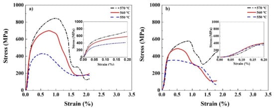 Figure 6 shows the compressive stress–strain curves of the samples in groups B and C. As shown in Figure 6, the compressive stress of the samples in both groups B and C increased with the process temperature. At 550 °C, the maximum compressive strength of the sample in both groups was significantly lower than in the samples manufactured at 570 °C. This result implies that increasing the process temperature reduces the pore volume inside the sample, improving the load transfer to the Al matrix and possibly homogenizing the stress distribution under compression. The maximum compressive stress was much higher in the sample of group B than in the sample of group C, probably because the strength of the Mg2Si phase was superior in group B (recall that the Mg2Si phase in the sample of group C was deformed; see Figure 5). The higher the strength of the Mg2Si phase, the higher the resistance to compressive stress when the load transfer in the Al matrix decreases. Additionally, in general, the compressive strength of aluminum is reported to be about 140~250 MPa [,,]. As shown in Table 4, it was confirmed that the compressive strength of the group B and C samples prepared through the SSP improved compared to the general compressive strength of aluminum.