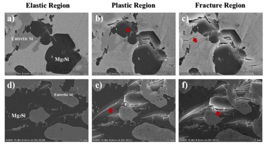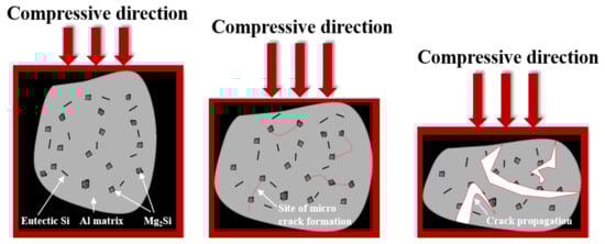 Figure 7 shows the fracture behaviors of the Mg2Si, eutectic Si, and Al matrices in the group B and C samples under compression. Samples in both groups displayed similar fracture behaviors of each phase. The fracture mode of each phase develops in three stages, as shown in Figure 8. First, cracking begins in the elastic region as stress is concentrated in the Mg2Si phase, and micro-cracks are found only in the Mg2Si phase. Second, when the maximum compressive stress is reached, the cracks begin propagating along the Mg2Si phase (Figure 7b,e). Finally, the cracks propagate along the Mg2Si phase to the eutectic Si and Al matrices (Figure 7c,f). The compression fracture behavior of the Mg2Si phase confirms a lower maximum compressive strength of the sample in the group C sample than in the group B sample. Meanwhile, panels b and c of Figure 7 confirm larger cracks in the Mg2Si phase of the group C sample than in the group B sample, which can be explained by the higher compressive stress of the Mg2Si phase in the group C. The low maximum compressive stress of the sample in group C is probably explained by the reduced strength of the Mg2Si phase in the group C sample after deformation during the manufacturing process.