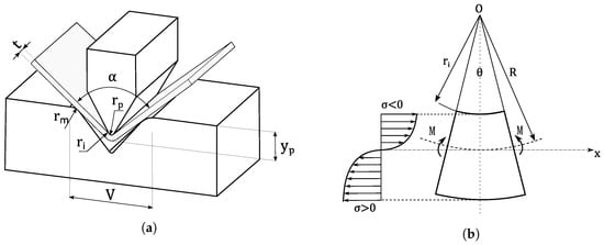 (a) Air bending process parameters: die opening (V), die radius (rm), inside bending radius (ri), punch nose radius (rp), punch penetration (yp), sheet bending angle (a), sheet thickness (t); (b) stress distribution in plastic bending deformation.