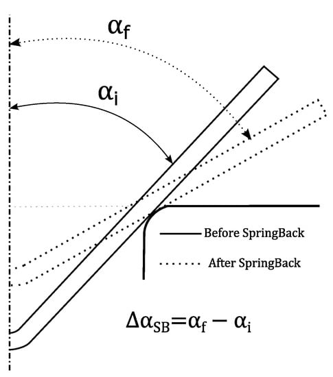 As mentioned earlier, the springback effect plays an important role in bending processes. As represented in Figure 2 the removal of the tools leads to elastic recovery of the material, which results in different bending angles before and after springback. The springback angle, , corresponds to the difference between the angle after elastic recovery, , and the bending angle defined when the punch contacts the part, . The springback is entirely intercorrelated with the stress distribution on sheet metal as residual stresses []. Its behavior is also affected by material properties such as strain hardening, elastic property evolution, the presence of Bauschinger effects, elastic and plastic anisotropy, and tribology between contacting surfaces []. Although there are mathematical models for predicting springback in bending situations, most of them are simplistic and do not take into account all influential factors.