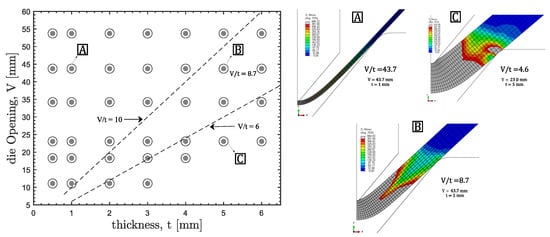 The die opening is a significant influencing factor in the bending process. The typical bender’s practice is to choose the die opening based on the sheet thickness. The ideal combination of sheet thicknesses and die opening can be defined by practical guidelines derived from industrial process experience. Linear relationships between those variables (Equation (3)) characterized by a scalar factor can be utilized to determine the boundaries of suitable combinations. Normally, factors with values between 6 and 10 establish the limits of appropriate combinations for a correct bending operation.