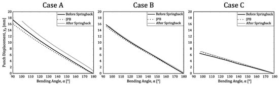 Punch displacement () graphs as a function of required bending angle () for cases A–C.