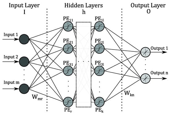 Neural network: example of a feedforward structure, with m input nodes, several hidden layers with specific numbers of processing units (PE) each implementing a nonlinear function (i.e., sigmoid), n output nodes implementing a linear function and interconnections weights (i.e., and ).