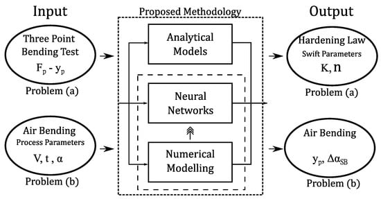 In the first problem, mechanical characterization with three-point bending, the results show a good agreement with the simulation and reference models, being able to closely predict the material K and n parameters in the ranges 400 to 1600, and 0.05 to 0.35 respectively, and characterizing adequately the strain–stress curves in the range of interest, i.e., up to 0.2 strain values. In the second problem, press-brake bending, it can be concluded that a single structure ANN was efficient in predicting simultaneously the required punching displacement and the springback angle. It was also proved beneficially to include a second learning task to better predict the punch displacement.
