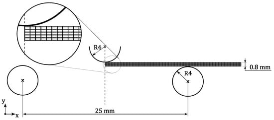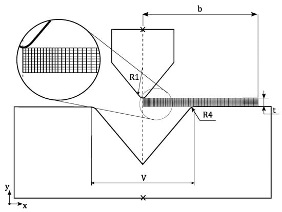The air bending process and the three point bending test can be defined as plane strain problems, in which the blank width is much larger than the blank thickness. Due to the symmetry of these two proposed bending processes, only half of real experimental setup was considered in the 2D finite element model. Figure 9 and Figure 10 illustrates the fundamental geometry and variables defined for FE models, used for the bending problem (a) and press-brake bending problem (b), respectively. Both numerical models were validated by experiments in previous works [,].