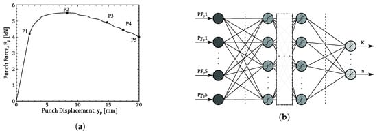 In this problem, the input data, provided by FEA, consists of a punch force-displacement, , curve comprising a total of 730 discrete points. In feedforward shallow ANN, each layer is fully connected to the next layer, which in this problem makes unpraticable to use all points as elements in the Input layer. So, in order to simplify the ANN structure and reduce the number of parameters to be adjusted, only five points were considered as illustrated in Figure 11a. P1 corresponds to the point that divides the elastic deformation zone, characterized by a linear trend, from the plastic deformation zone on the test curve. On the other hand, P2 represents the point of maximum force in each test. Similarly, P3, P4 and P5 are points with arbitrarily chosen fixed displacement values (15 mm, 17 mm, 20 mm) used in each curve. Therefore, as represented in Figure 11b, the feedforward ANN for this first problem will be characterized by ten processing elements corresponding to the five pairs of punch force-displacement values in the input layer and two output values corresponding to parameters K and n of the Swift law, represented in Equation (1).