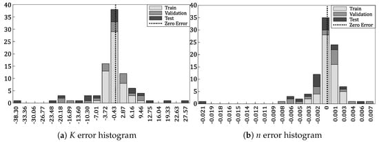 Neural network histogram of errors for (a) K output variable and (b) n output variable considering un-normalized values, all data sets and considering grouping each of the 91 cases error in 20 classes (i.e., bins).