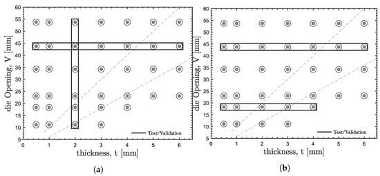 A total number of 37 cases were used (Figure 15) resulting from different combinations of die opening and material thickness (Table 5). Two different separations of data (DD1, DD2) between training and validation/testing sets were used in the multiple runs of ANN development stages. In both separations, the same proportion of training (25/37) versus validation/testing (12/37) was used. An automated Bayesian regularization learning algorithm using the respective learning function available in Matlab (‘trainbr’) [] combined with early stopping, and the mean squared error (MSE) performance function, as it could enhance reduction of extreme errors.