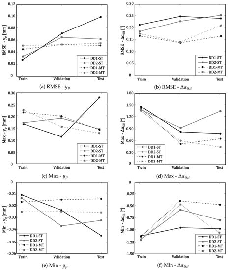 Performance measures of neural networks for the two different data sets (DD1 and DD2) and considering both single (ST) and multitask (MT) ANN structure; all performance measures are presented for the train, validation and test data sets; (a) punch displacement (yp) RMSE value; (b) springback angle (ΔαSB) RMSE value; (c) punch displacement (yp) maximum value; (d) springback angle (ΔαSB) maximum value; (e) punch displacement (yp) minimum value; (f) springback angle (ΔαSB) minimum value.