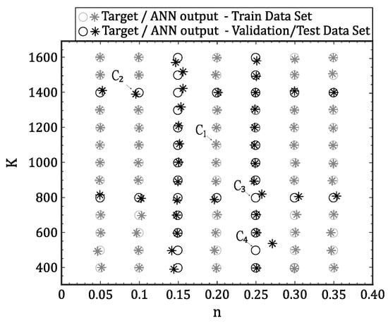In this section it will be presented, with detail, the results obtained for problem (a) in order to evaluate the influence of Swift parameter prediction error directly on a stress–strain curve. In this context, Figure 17 illustrates in a graphical format the 91 combinations of K-n used for the neural network development. This diagram shows not only the expected target (circle marker) but also the ANN output (star marker). The train data set (light color) and the validation/test data set (dark color) are all represented. These results support the performance analysis presented in Section 3.1 since, in general, the developed ANN can predict with accuracy the Swift parameters for the majority of the total cases. However, for some combinations, a substantial disagreement between output and target value is evident, especially for cases that belong to the validation and testing data set. Table 6 summarizes the differences between target-output values, for different cases to , also identified in Figure 17, in terms of relative error for both Swift parameters. For case , the relative errors are quite low (less than ) as expected, since this combination belongs to the train data set. On the contrary for cases belonging to validation/test data set (, , ) the errors are systematically higher, however always bellow 5%, except for one case (C4) which is bellow 9%. The higher error (C4) occur in 1 out of 91 cases, and therefore it can be considered an outlier for the test/validation data set.