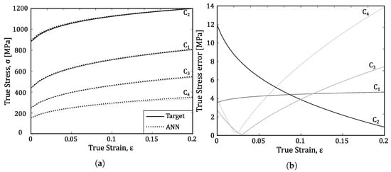 True stress–strain curves (a) for cases C1 to C4 considering the Swift parameters obtained using ANN and its comparison with the expected target results; (b) corresponding true stress error (|σTarget − σANN|) for each case and true strain values between [0, 0.2].
