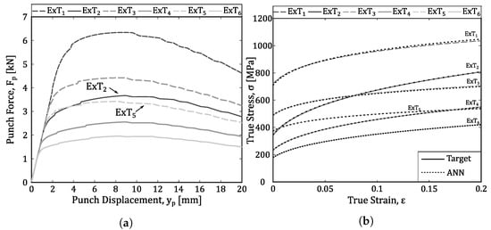 In order to confirm the results prediction, complementary tests were performed. For that purpose, an additional database was created, using FEA, considering Swift parameters that were not used in the development of the ANN. These new target parameters ( and ) are summarized in Table 7 for six different extra tests. Additionally, the numerical punch force-displacement curves are represented in Figure 19a for each extra case. In this point it is important to note that the extra cases two and five have similar - curves, and this proximity is especially evident in the elastic-plastic transition zone. However, the Swift parameters are completely distinct. Regarding the ANN prediction for these extra cases, the Swift parameters obtained using the developed neural network ( and ) are in closer agreement with the targets, with relative errors below 2.5% for ExT and 5.8% for ExT. Figure 19b represents the resulting hardening Swift curves (Equation (1)) for these considered extra cases with the parameters predicted using ANN (, ) and the corresponding reference values (, ). As previously observed, the true stress–strain curves (Swift) for both cases are in a good agreement for strain values between 0–0.2. Among these new cases, the ExT and ExT are of particular interest as, although having closer three-point bending test curves, the respective stress–strain curves are quite different. Observing the ANN performance in these two cases, Figure 19b, it can be verified that the ANN performs equally well. Therefore, it can be concluded that the five point selection, that represents the information from the bending test curves given to the ANN, it was usefully used by the trained ANN.