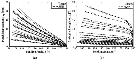 Turning now to problem (b), in this section it will be presented the results obtained by the multitask ANN developed in Section 3.2, using the DD1 division set (MT-ANN, DD1). In this context, Figure 20a,b details, respectively, the punch displacement () and the springback angle () curves as a function of required bending angle (), for the 37 V/t combinations. This representation illustrates the overall capability of the developed ANN to model, in the same structure, two different, although related, functions ( and ), and in a significant range of input parameter values (V, t, bending angle). It can also be observed that in the prediction of the springback angle, higher oscillations occur in relation to the reference curves.
