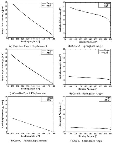 In order to evaluate the results of this problem in more detail, the three cases (A, B and C), presented in Section 2.1.2 (Figure 4, Figure 5 and Figure 6), will be studied in this analysis. As already mentioned, these three cases correspond to different bending conditions: case A ( = 43.7) is characterized by an excessive springback angle, case C ( = 8.7) is characterized by indentation, and finally case B ( = 4.6) where none of these phenomena occur and the bending conditions are considered appropriate, in closer agreement with analytical models and industry guidelines. Additionally, it can be noted that cases A and B belong to the test and validation data set, while case C belongs to the training data set, following the proposed data sets division (DD1), as represented in Figure 15a. It can be observed (Figure 21) that the ANN performs equally well in the three cases, which means it can provide a solution to a wide extension of the bending angles, that can be obtained with the same set of tools, in addition to the industry guidelines.