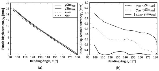 Air bending is one of the most frequent plastic deformation methods used on parts made from flat sheets. As represented in Figure 1a, the main objective of this process is to obtain a desired bending angle, , in a sheet metal material by applying a specific punch displacement, . The main process parameters include: (a) the tools geometry, which comprises the die opening, V, die radius, , and punch radius, ; (b) the blank material, which includes not only the sheet thickness, t, but also the material properties (e.g., type of material, hardening law, yield stress, ultimate tensile strength, elongation) [].