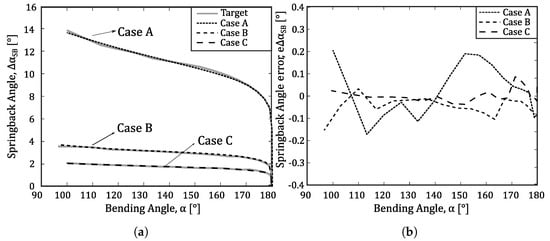 Sprinback analysis for cases A, B, C: (a) springback angle (ΔαSB) and the corresponding expected value (Target) as a function of required bending angle (α); (b) springback angle error (eΔαSB) for each case as a function of required bending angle (α).