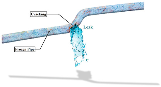 In recent years, the “Polar Vortex” phenomenon in which the jet stream weakens, and the cold vortex of the North Pole descends south has occurred owing to the reduction in temperature difference between the North Pole and mid-latitudes caused by global warming, thereby increasing the intensity of the cold wave annually. As the minimum outside temperature in winter decreases under the influence of the intensified cold wave, the freezing of industrial and household piping systems is also increasing each year, causing enormous economic losses. Water freezes and its volume expands when the temperature drops below 0 °C. Solid water, composed of hexagonal molecular structures joined by hydrogen bonds, expands the volume by approximately 9% to 10% by increasing the distance between molecules during freezing. When the pressure generated by the increase in volume temperatures exceeds the maximum inner pressure of the water pipe, a crack in the inner wall of pipes propagates and results in breakage of the pipe, as shown in Figure 1.