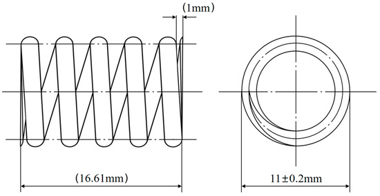 Experiments and simulations are essentially required to identify the mechanical properties of the Ni-Ti-Co SMA coil springs since there is no metal standard available for the alloy used. By this token, the SMA coil springs were designed prior to experiments and simulation in accordance with Korean Industrial Standard (KS) [20,21,22]. After the drawings and design parameters of the SMA coil springs shown in Figure 3 and Table 2 were determined, the prototypes of SMA coil springs were fabricated for the SLT to obtain the spring constant values and evaluate the performance of the SMA coil springs. The Ni-Ti-Co SMA wire, which was the raw material, was used to create the spring shape through a spring forming machine, shown in Figure 4, and it was subjected to natural aging after annealing in a furnace at 490 °C for 30 min. The heat treatment temperature was designated in view of the precipitation of nickel for hardening-related transformation temperature so that the transformation initiation temperature could be between 0 °C and 5 °C.