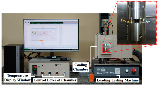 An SLT machine and a cooling chamber (MTDI Inc. Daejeong, Korea) shown in Figure 5 were used to obtain the spring constant data of SMA coil springs. A cooling chamber that included control devices such as a temperature display window and control levers was used to vary the temperature of the SMA coil spring. On the temperature display window, the temperature value of SMA coil springs was displayed over time. Four control levers inside the cooling chamber ensure that different functions such as lighting, cooling, heating, and power could be controlled individually.