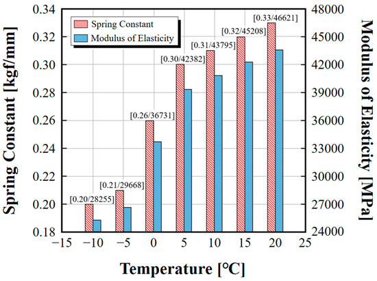 As for the test method to measure the SMA coil spring constant, the load tester and cooling chamber equipment were turned on and then stabilized for 30 min. After that, the SMA coil spring was set on the guide shaft, and zero-point adjustment was performed so that the spring could move to the point of contact with the jig. Test conditions, including the load, temperature, time, and data storage path, were entered into the program before starting the SLT. The static load of 1.6 kgf was continuously applied in the spring compression direction, and the spring constant was measured while the temperature of the SMA coil spring varied from −10 °C to 20 °C. The SMA coil spring, which was fabricated based on the design parameters in Table 2, was used in the SLT. During the SLT, the spring constant was measured using Hooke’s law in real time by detecting the spring deflection based on the initial set point of 0 mm and the static load value of 1.6 kgf.