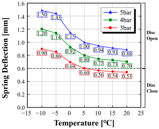 Through structural analysis, the deflection in the y-axis direction and von Mises stress occurring in the SMA coil springs were calculated and are shown in Figure 8 and Figure 9. The results of the graph in Figure 8 are regarding the deflection in the y-axis direction that occurred in the SMA coil spring when a pressure of 3 bars was completely transferred, and the values tend to be inversely proportional to the temperature. The minimum deflection values of SMA coil springs were calculated to be 0.53 mm at 3 bars, 0.7 mm at 4 bars, and 0.88 mm at 5 bars, respectively. These are the results obtained by increasing the deflection of SMA coil springs by adding the weight of the disc. Assuming the weight of the disc is removed, the deflection values derived from the theoretical formula would be 0.09 mm at 3 bars, 0.12 mm at 4 bars, and 0.15 mm at 5 bars.