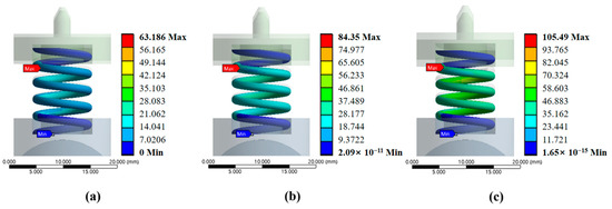 Von-Mises stress distribution of SMA coil springs applied the specific water pressure conditions to the top part of disc protrusion: (a) 3 bars; (b) 4 bars; (c) 5 bars.