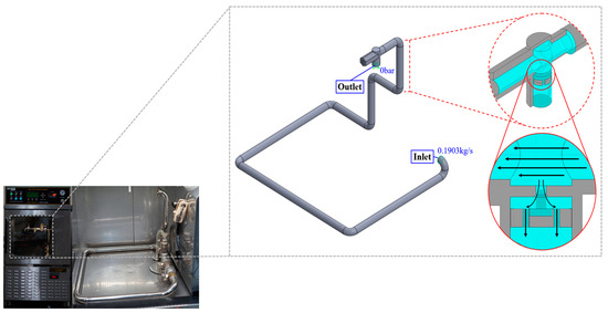 The mass flow rate value of 0.1903 kg/s was derived from the mass flow rate at a flow velocity of 1.308 m/s using Equation (4), called the Darcy-Weisbach Equation, and Equation (5), called the law of mass conservation; it was applied to the inlet of pipes [23,24].