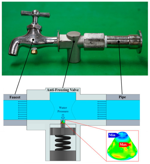 Therefore, this study proposes a new anti-freezing system that can automatically prevent the freezing of a pipe in real time using the springs made of Ni-Ti-Co SMA coil springs. SME characteristics of SMA coil springs installed inside the new actuator model were utilized for automatic actuation, and a new anti-freezing system called the “fluid resupply system (FRSS)” was constructed in Figure 2, in which the circulation and discharge of water occurred by installing an anti-freezing valve in the water pipes.