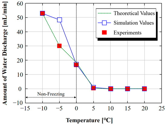 The built FRSS was put into the chamber during the WDT, and the temperature was changed to measure the amount of water discharge. After the target temperature was set at 5 °C, the time taken for the temperature to decrease from 20 °C to 5 °C was set to 30 min and cooled slowly. The cooling time was set to 10 min, and the experiment was performed again after changing the target temperature to 0 °C. It was confirmed that the start of water discharge occurred while the temperature in the chamber decreased from 5 °C to 0 °C. For accurate water discharge measurement, water discharge per minute was measured through the anti-freezing system immediately when the temperature in the chamber reached the set target temperature, with the flow rate stabilization time for 30 min. The target temperature interval in the chamber was set at 5 °C. Additionally, the temperature was gradually decreased from 20 °C to −10 °C. In addition, the amount of water discharge according to the temperature was measured 7 times each through the 10 repeated experiments.