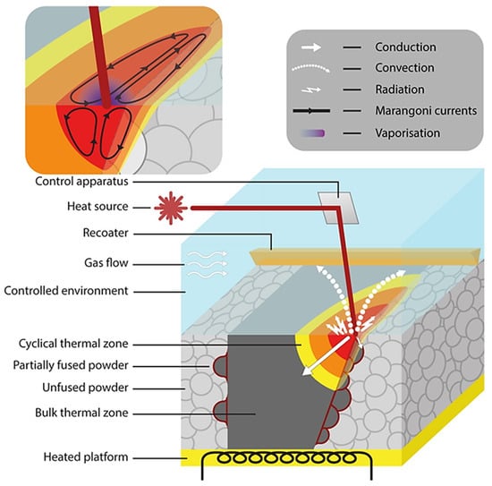 A schematic showing the complex thermal and fluid dynamics phenomena that occur in a powder bed fusion process. Reproduced from [] with permission from Elsevier. The heat source can be a laser beam or an electron beam. In the latter case, the build platform is usually preheated.