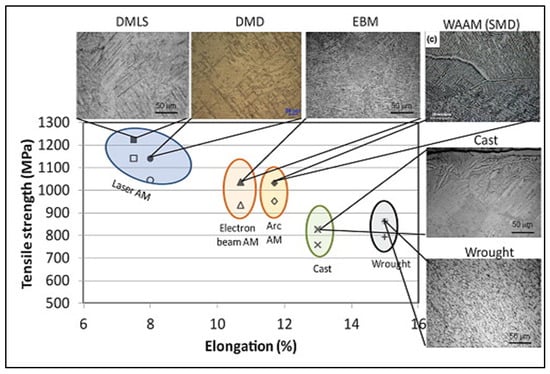 Microstructures and room-temperature tensile strengths of AM Ti6Al4V alloy produced using various AM technologies compared with those of traditional methods. Reproduced from [] with permission from Elsevier. (DMLS = Direct Metal Laser Sintering, DMD = Direct Metal Deposition, EBM = Electron Beam, WAAM = Wire Arc AM, SMD = Shaped metal Deposition).
